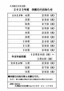 【久喜総合文化会館】2025年度休館日・施設抽選のお知らせ